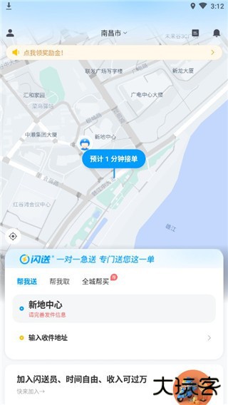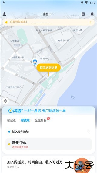 1、在本站乐玩网下载并安装闪送同城快递APP,进入软件,将坐标放置在自己所在的地方,即可上门取货送出