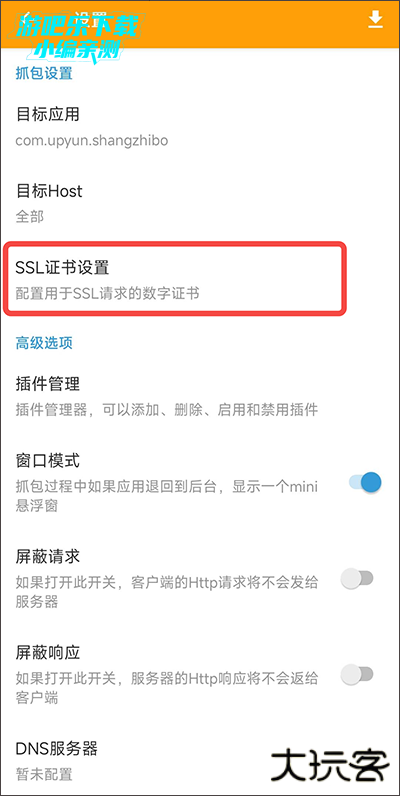点击左上角菜单(三横)→ 设置 → 抓包设置 → SSL 证书管理