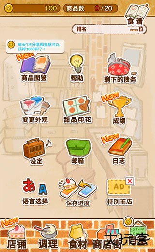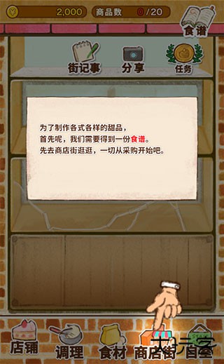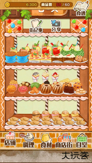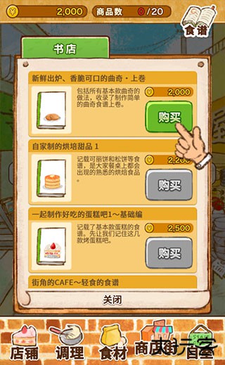 2、点击底部的【商业街】可以采购各种食谱来制作美味的甜品。