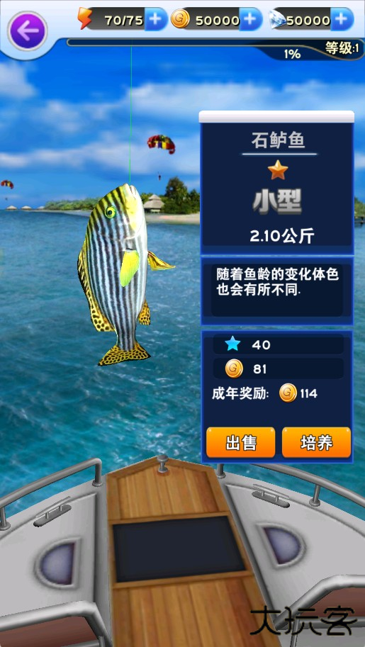 5、成功钓上鱼后,可选择出售获取金币,或培养提升价值。
