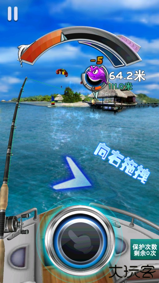 3、长按下方按钮收紧鱼线,松开可缓解拉力,反复操作积攒怒气值。