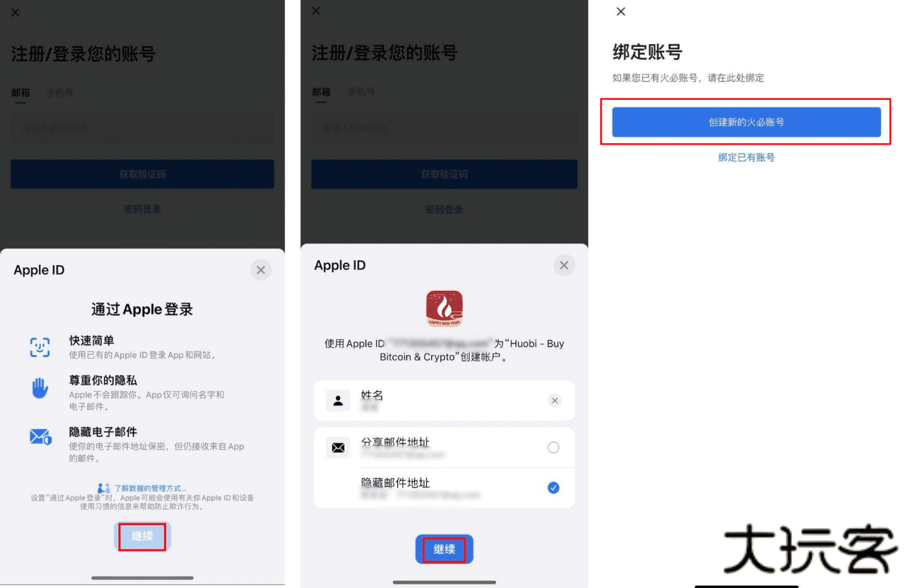 在注册页面,选择【通过Apple登录】,系统将提示您使用的Apple ID登录火必,点击【继续】。选择【分享邮件地址】或者【隐藏邮件地址】,点击【继续】。选择【创建新的火必账号】,跳转至设置密码,随后完成注册。