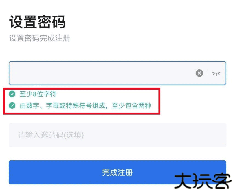 2、为您的账户设置密码。为了账户安全,设置账户密码时,请确保密码由数字、字母或特殊符号组成,至少包含两种,长度至少8位字符,格式合格后密码下方的要求会变成绿色。