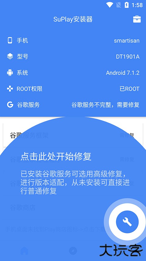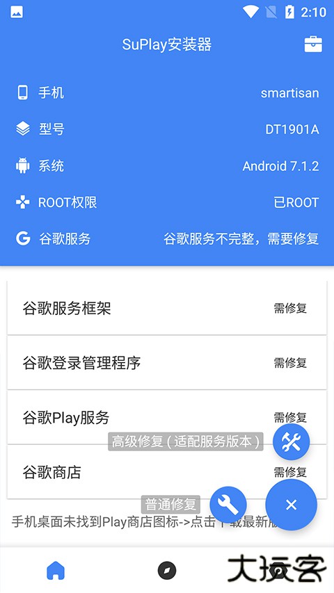 1、在本站下载安装软件之后,点击打开软件,之后软件会获取你的手机信息,我们需要点击下方的修复键位,对谷歌服务进行修复;