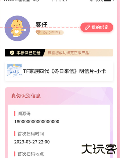 1、进入主页,查看防伪识别信息,点击【我的绑定】