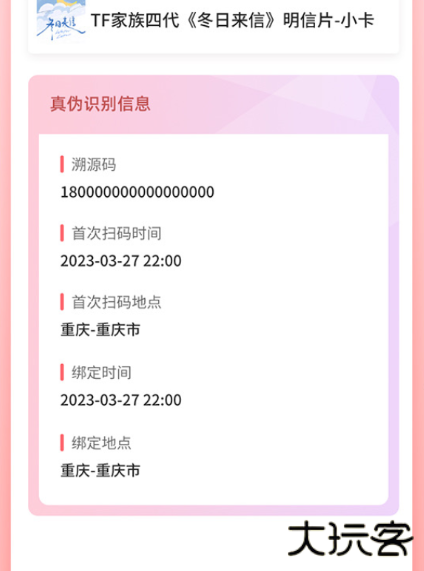 使用TF家族防伪码功能前,需先将手机内时代峰峻FANCLUB APP进行版本更新,iOS系统下需更新至1.0.5,安卓系统下需更新至1.0.6。
