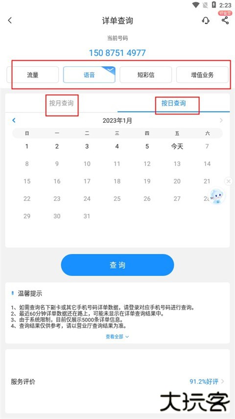 4、进入查询后,可选择流量、语音和短信,”语音“即为通话记录。每个电话通话时常都能找到。