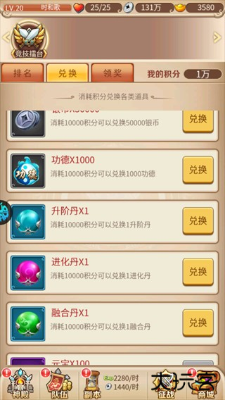 1、竞技场每天可以产出积分消耗积分兑换升阶丹、进化丹