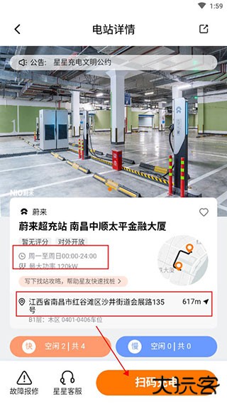3、点击进入可以了解到充电桩的一些具体信息和地址,赶到后选择扫码充电扫描充电桩上的二维码即可使用。