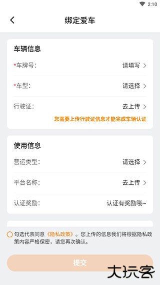 2、在这里可以通过上传行驶证来一键认证,也可以只先绑定后续在进行认证。