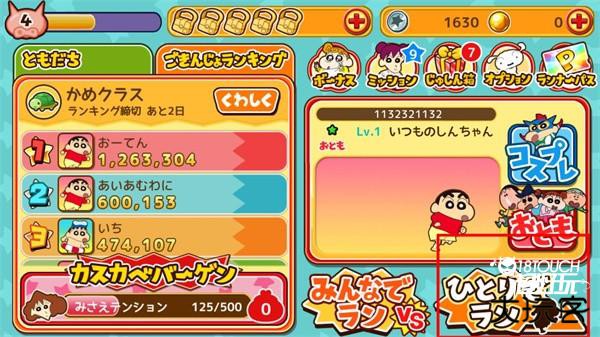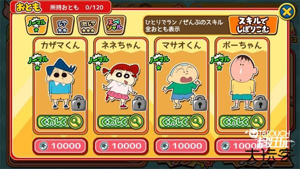 5、最后,当然了除了小新之外,动画片里的其他小伙伴们也会逐一出场。春日幼稚园的风间君、妮妮等朋友如果跟着小新一起跑的话,会产生意想不到的好效果哦,比如进一步提高分数等等。不过想要跟换其他小伙伴也是需要金币的哦!
