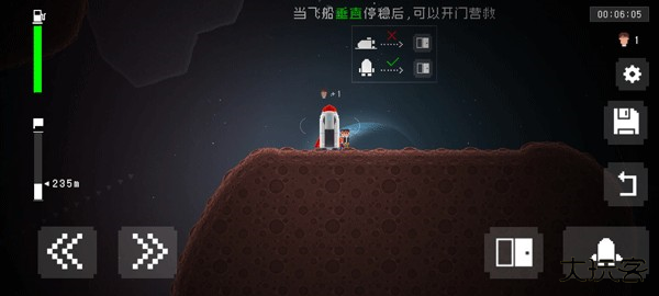 4、游戏的玩法就是发射火箭到每一个小区域,每个区域都有可能有幸存者,你需要将他们救出来,当飞船停稳后,左边红色箭头指向的燃料就会自动恢复过来。