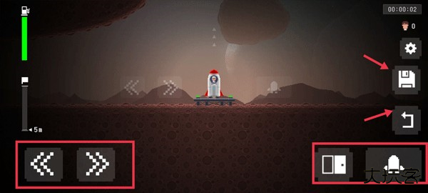 3、接下来介绍一下基本功能键,左边的是左右方向键,用来控制火箭的方向,右边是开舱门和发射按钮,红色箭头指向的功能一个是返回到初始状态,一个是用来存档。