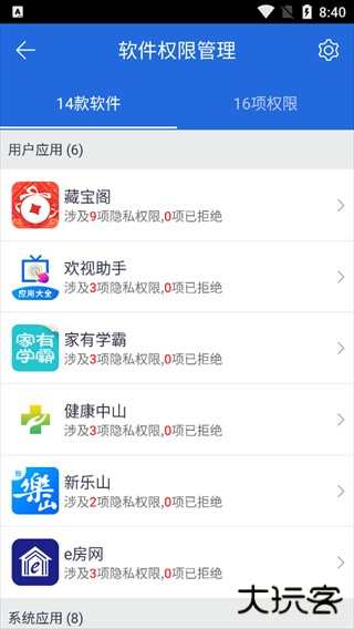 展示手机中的隐私权限情况,可查看各应用涉及权限及拒绝项