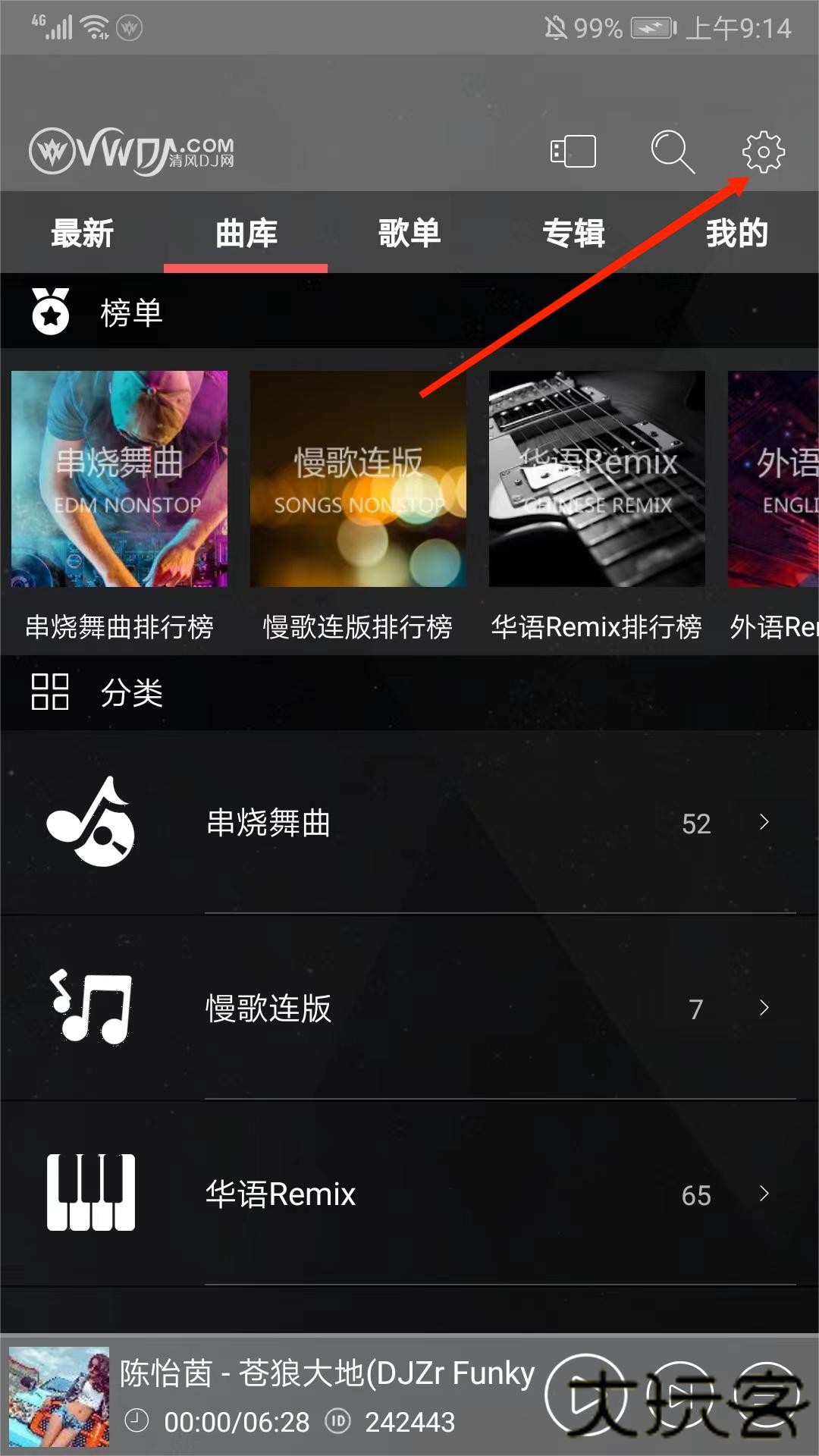 1、首先打开清风网dj音乐,进入主界面,点击右上角的“齿轮”图标。