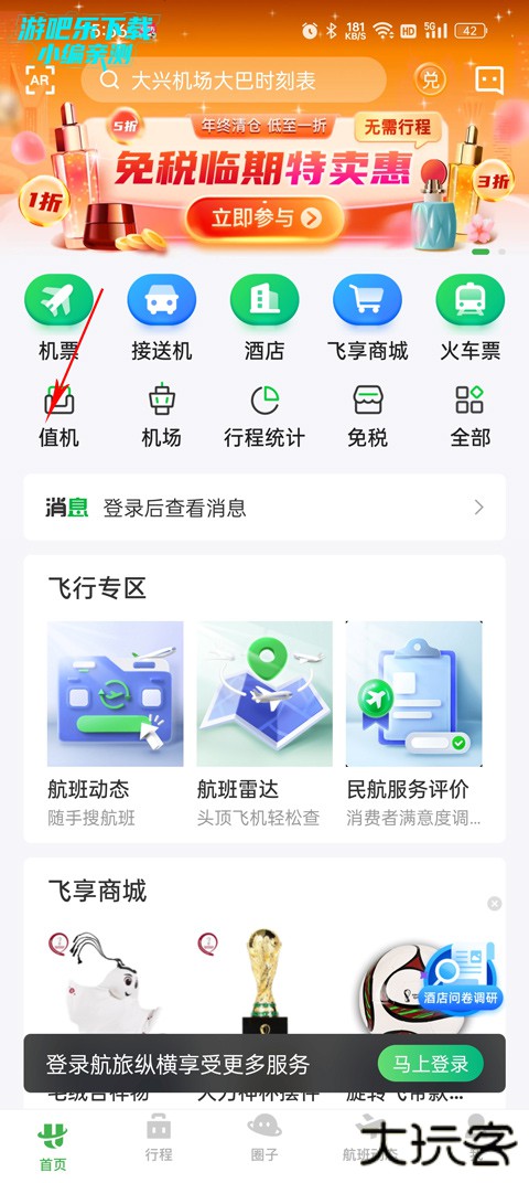 2、来到首页之后,点击首页功能界面中的值机进入页面;