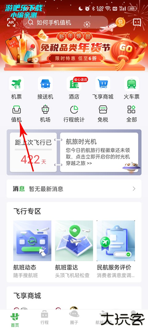 1、用户打开软件之后,在首页的机票下方找到值机入口,点击进入值机板块;