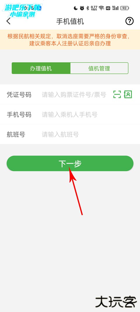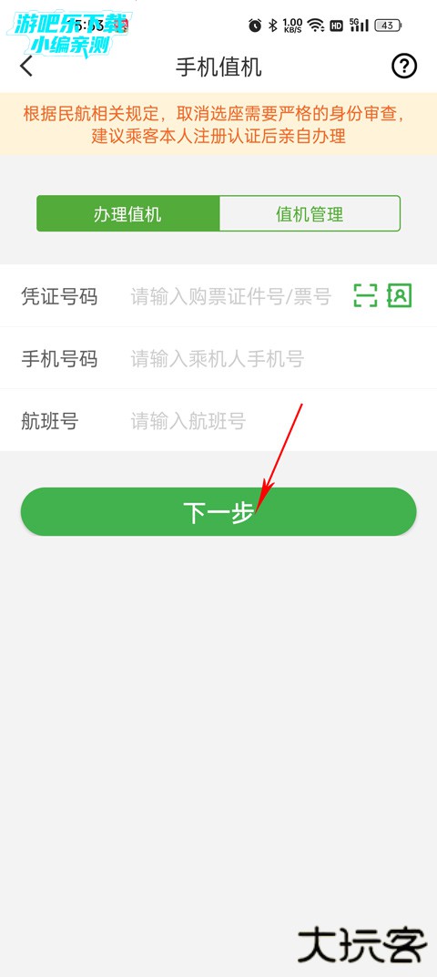 3、进入手机值机页面之后,填写凭证号码、手机号码、航班号,最后点击下一步,就可以进行快速选择想要的座位了。