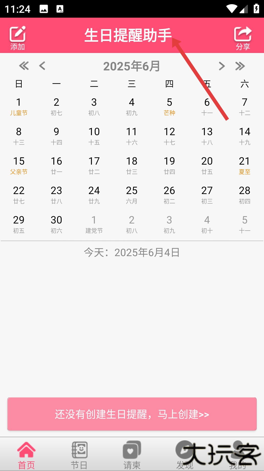 3、进入生日提醒助手首页,点击粉色马上创建按钮,就能添加重要生日信息,轻松管理纪念日 。