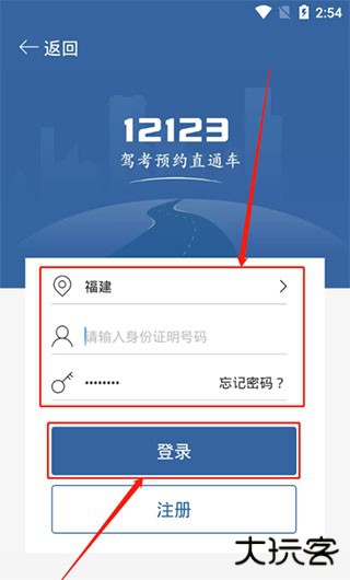 4、这边需要登录一下,选择自己驾考报名的省份,填写要查询的人身份证号和交管12123的密码。