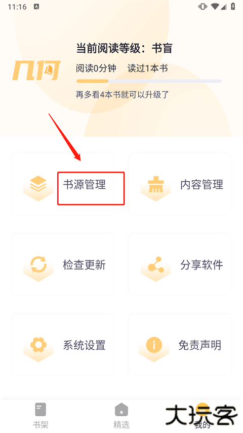 1、在app我的界面中点击书源管理功能