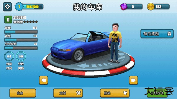 5、游戏主界面可以选择人物服装,定制车辆,在商店里购买汽车