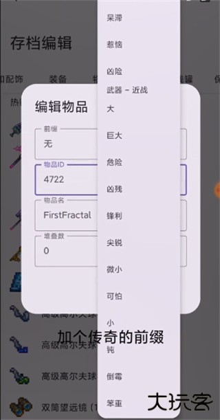 4、包括呆滞、惹恼、凶险、巨大、危险、锋利、可怕等各种各样的前缀,这里以传奇的前缀为例,