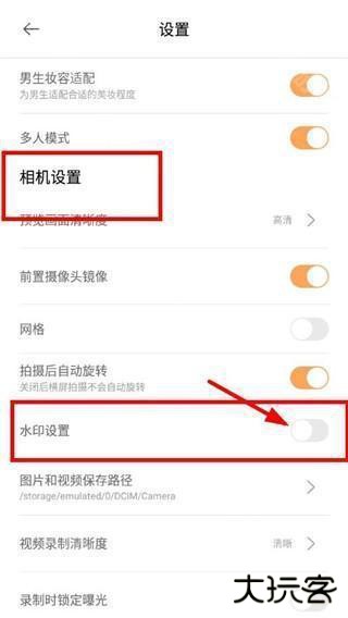 4、再在【相机设置】栏将【水印设置】右侧的开关,关闭即可