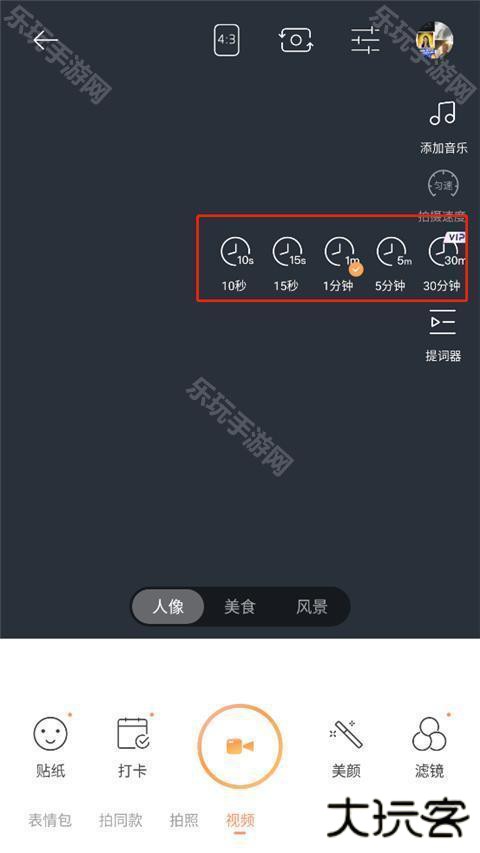 3、然后再右边的添加音乐、拍摄时长、拍摄速度、提词器中,点击拍摄时长,里面唯一用户提供了10秒、15秒、1分钟、5分钟、30分钟的视频时长选项;