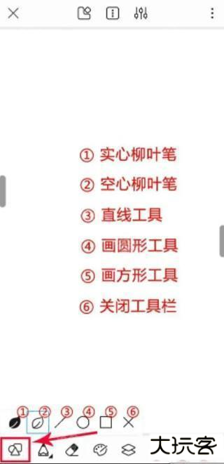 进入绘画界面后,点击界面下方第一个图标,也就是工具菜单,点击后,会出现六个工具选项,分别为“实心柳叶笔”、“空心柳叶笔”、“直线工具”、“圆形工具”、“矩形工具”以及“关闭工具栏”六个选项。