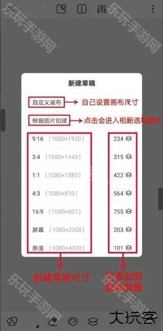 点击“绘画”选项,接着会弹出“新建草稿”设置窗口,这里有软件自带的画布尺寸,也可以点击“自定义画布”选项,然后自己设置画布尺寸,还可以点击“根据图片创建”选项,在相册中选择图片。