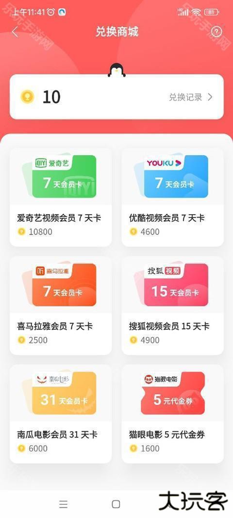 5、当然玩家还可以赚取积分,从而用积分来兑换爱奇艺视频会员、优酷视频会员等福利。