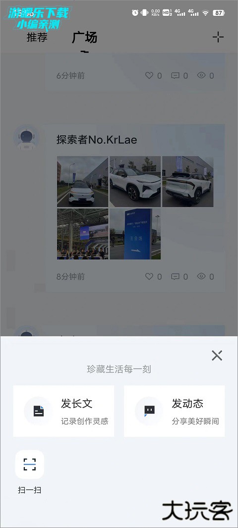2、在“探索”选项中可以查看品牌动态,“广场”中可以发长文、发动态。