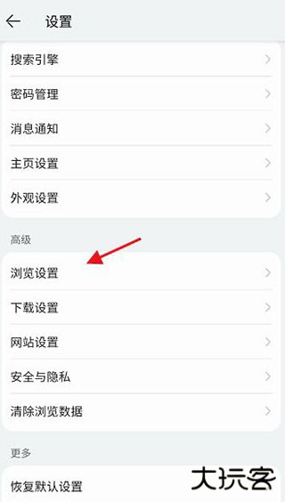 3、进入设置,找到下方的高级,点击浏览设置进入