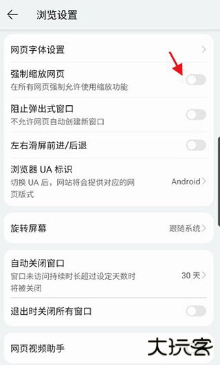 4、进入浏览设置,找到下方的强制缩放网页,点击右侧的按钮开启此功能