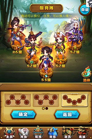 游戏中初步设定了雁行阵、飞鸟阵等多种阵型,玩家们也可参考伙伴的属性特点来自由搭配阵型,或让系统自动配阵。玩家点击主界面下方的布阵可以进入到阵型搭配中,点击阵型中的人物即可换人,通过换人和调整位置来布置战斗阵型。玩家还可替换阵型中角色的装备和修炼角色来提升他们的额外属性,但前期玩家等级较低时没有属性加成。