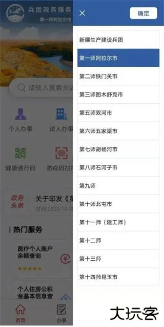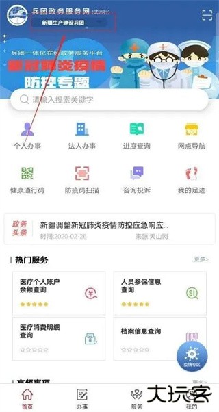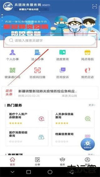1、注册并完成实名认证后,进入“兵政通”掌上APP首页,点击“新疆生产建设兵团”;