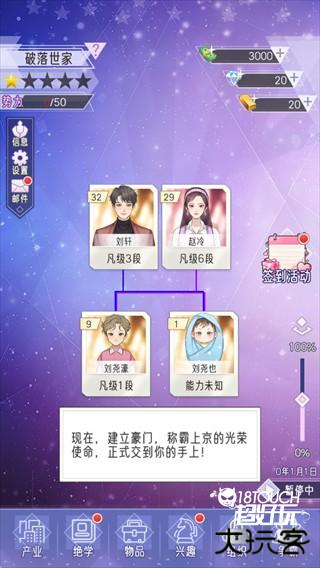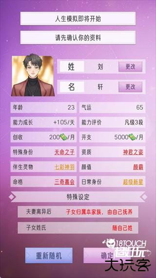 进入游戏后,先确认个人资料,包括姓名、年龄、气运、能力成长等属性,还可选择特殊身份、资质等设定,选好后点击【确定】正式开启游戏,你的使命是建立豪门、称霸上京、铸就百年荣光。
