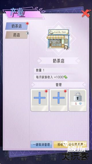 进入【产业】界面,可管理家族店铺,如奶茶店、药店等,可分配不同家族成员管理店铺,增加家族每月收入,也可通过钻石解锁更多管理席位,扩大产业规模。