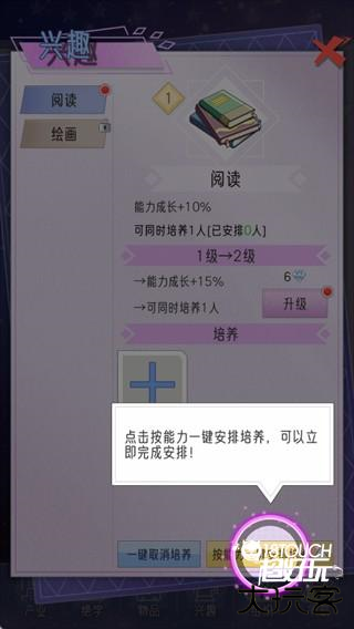 点击【兴趣】板块,可培养角色阅读、绘画等兴趣,能提升能力成长,可通过升级兴趣来提高加成效果,高效提升家族成员能力。