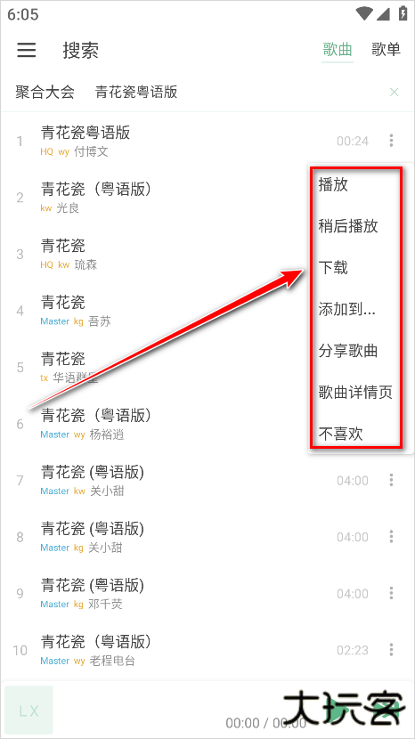 5、可以看到右侧会显示播放、稍后播放、下载、添加到、分享歌曲、歌曲详情页等功能,大家可以根据自己的喜好来点击相对应的功能哈。在这里小编以点击下载为例。