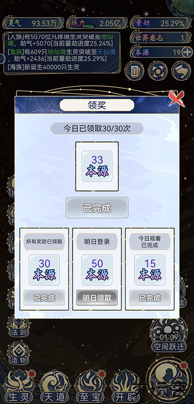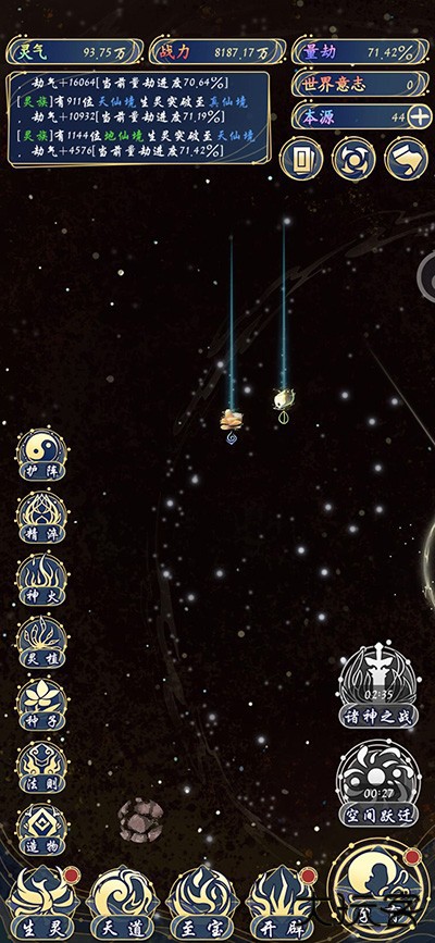 2、游戏目前有孕育、开辟、天道、至宝、生灵等玩法;