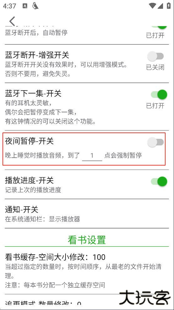 3、下拉找到“夜间暂停-开关”,点击开启,设置点数,到了设置的点数就会自动暂停播放