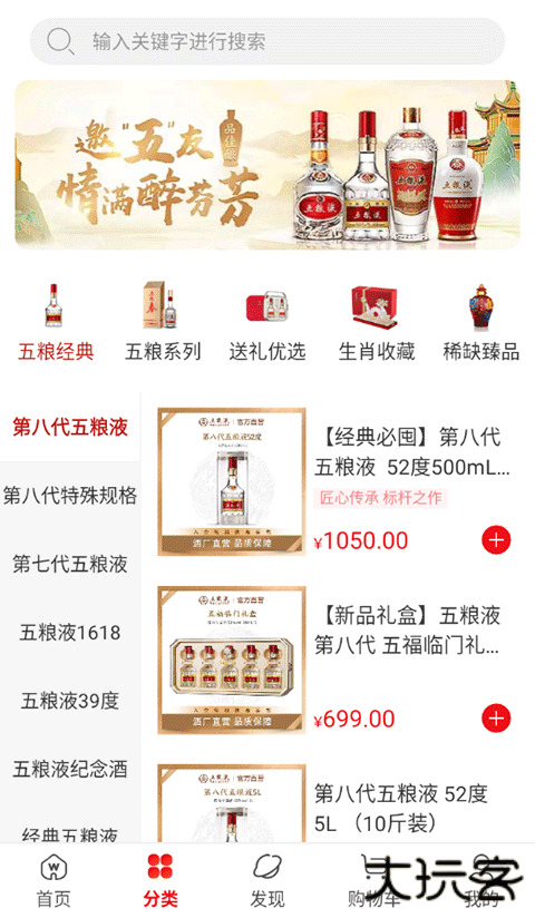 3、点击分类,大家可以看到各种度数年代的五粮液酒,自己喜欢的酒可以直接进行购买。