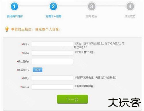 3、若验证成功,按页面提示的要求设置账号、密码、确认密码、所属学校、手机号和邮箱相关个人信息,单击“下一步”按钮: