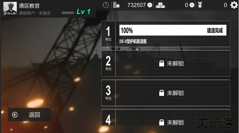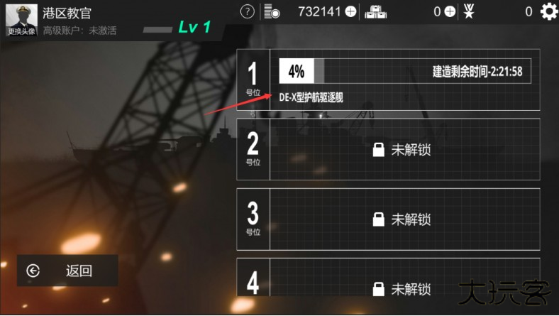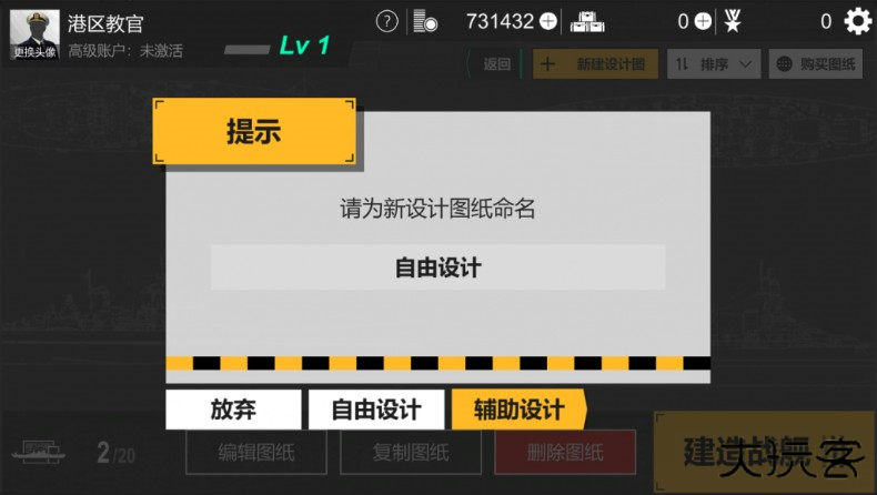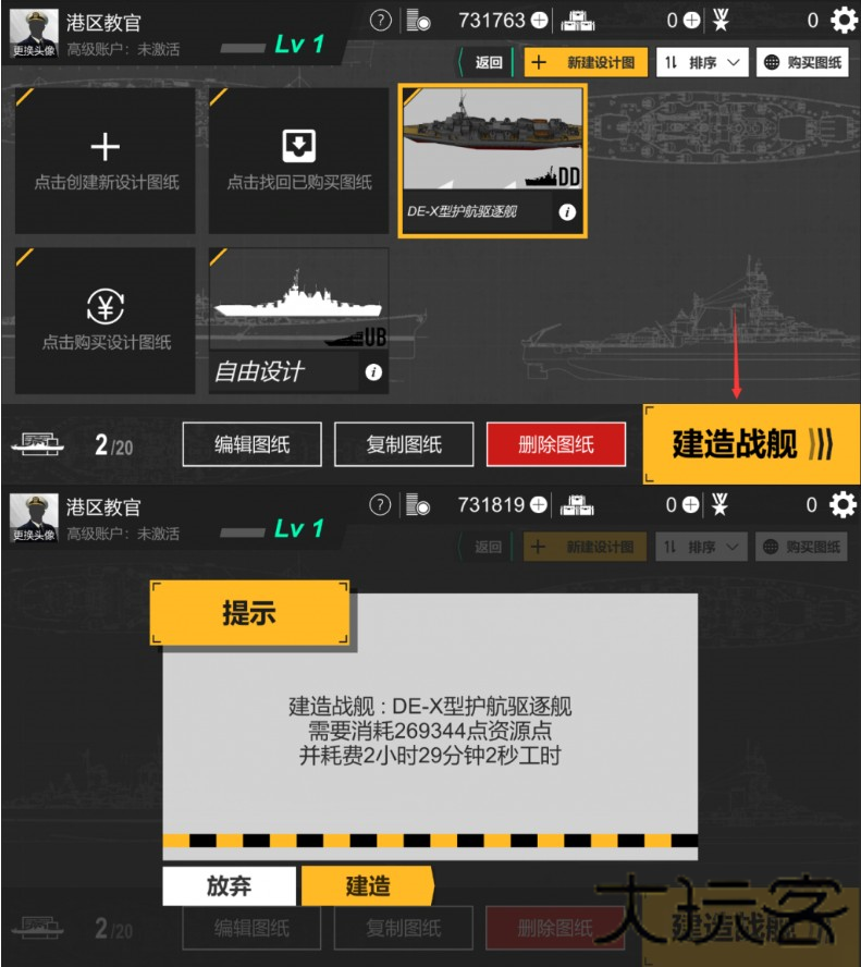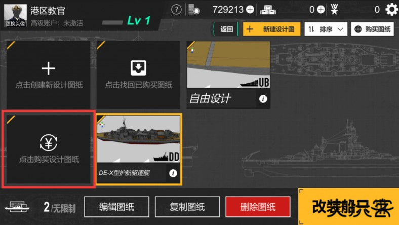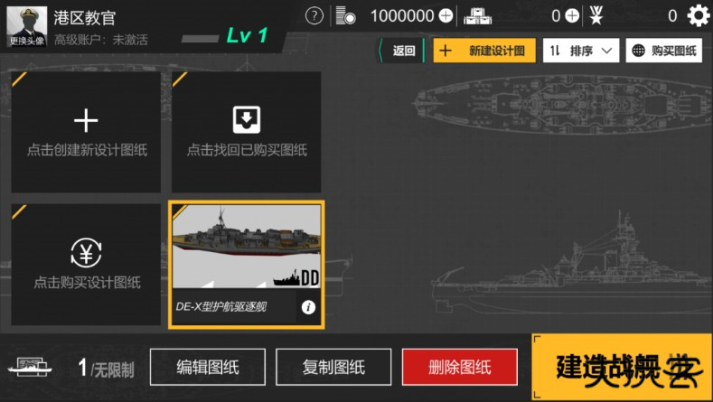 当您第一次进入港区时,您会获得一张“DE-X型护航驱逐舰”的图纸。您可点击右下方黄色”建造战舰“按钮直接进行建造,但在此之前,我们建议您自行设计战舰以体验工艺战舰的全部乐趣