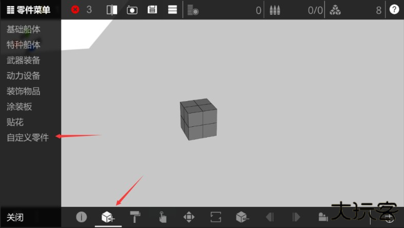 这八个方块即是您的图纸的初始内容,当您逐渐熟悉游戏后,可以尝试这样从零开始。作为初学者,我们建议您可以试试”自定义零件“这一便捷方式进行设计。