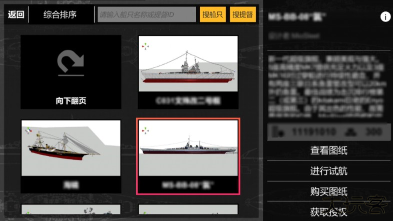 点击“购买设计图纸”按钮,可以进入游戏内的图纸交易大厅,在这里直接购买其他提督的优秀设计。同时您也可以查看其他提督的优秀图纸,并模仿其中结构加强您的设计