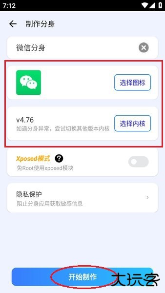 4、点击“选择图标”可以设置分身微信的图标,点击“选择内核”可以选择微信版本,设置好后,点击“开始制作”。
