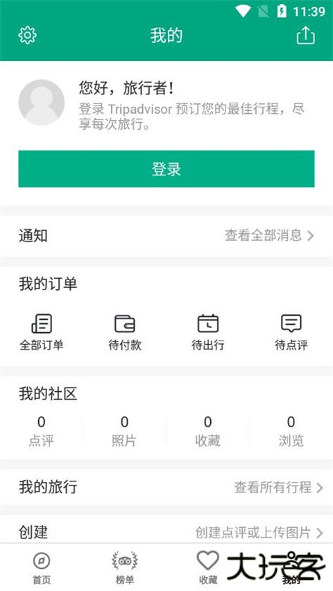 1、点击 Tripadvisor 主页顶部的“行程”图标,选择右下角的加号“创建行程”。